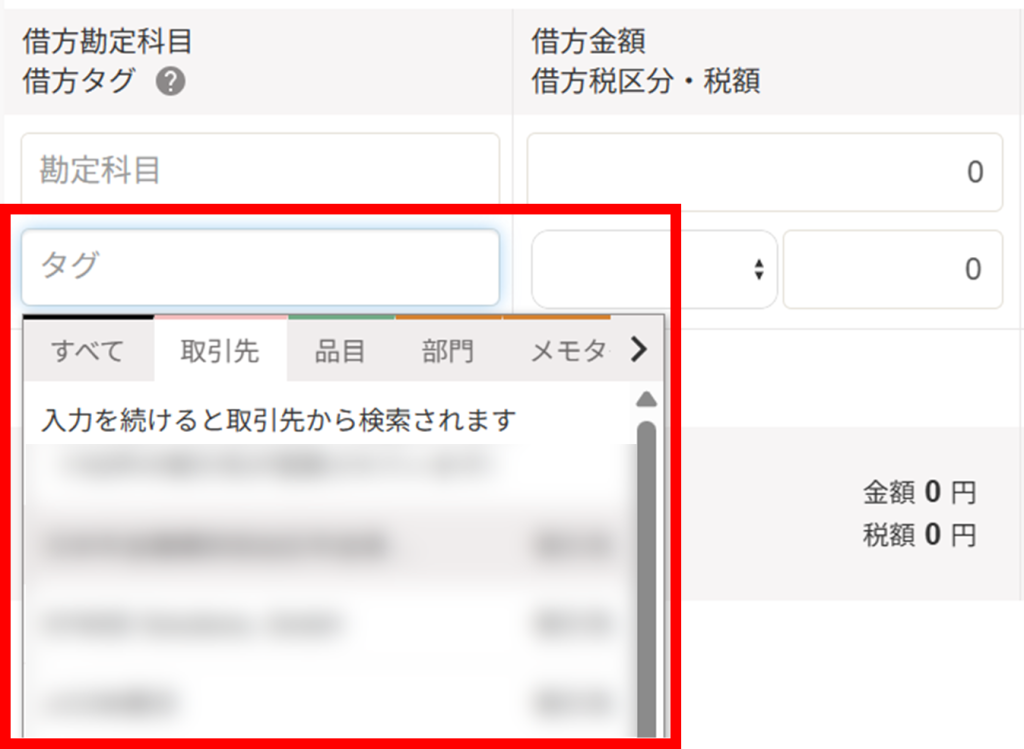 freeeのタグは、タグの種類が異なれば、1行の仕訳(取引)に対して「取引先タグ」+「品目タグ」+「部門タグ」+「メモタグ」のように、複数付与することができます(メモタグについては、複数付けることもできます)。予めタグの内容を登録しておき、取引登録画面や仕訳登録画面のタグを入力するスペースから選択します。