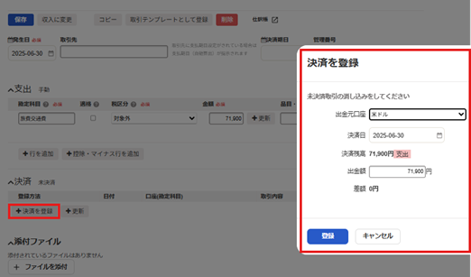 債権債務でなく外貨ですぐ支払った場合は、いったん未払金としておき当日決済したという形をとることで発生時にその日のレートで外貨を支払ったという形にします。