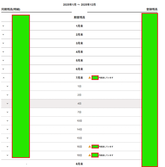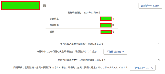 また、取引の重複登録のチェックは、「同じ月に、同一の勘定科目で、同じ取引先の、似たような金額」という固定された条件で取引がピックアップされるため、問題の無い誤検出も多めでした。「同じ日に・同じ金額で」など検索条件をカスタマイズできれば良いのですが。そんな中便利だと感じたのは預貯金残高チェックです。預貯金残高チェックでは、預貯金の実際残高とfreeeへの登録残高に差異があるとアラートを出し、freeeの「タイムライン」ページへ誘導してくれます。「タイムライン」では預貯金の実際残高とfreeeへの登録残高で差異が出たタイミングを日付単位で教えてくれるので、すぐにどこで差異が発生しているのかが分かりとても便利でした。