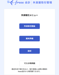 「外貨建取引管理アプリ」は外貨建取引を円換算しfreeeに登録してくれるアプリで、メニューの「外貨建取引登録」からは外貨建取引の発生時円換算を行ってくれます。また、「期末評価」からは外貨建債権債務の期末円換算を行ってくれます。いずれも、自動でレートを設定して計算を行ってくれるため、為替相場の情報を自ら持ってきて計算する必要がなく非常に便利です。また、対応している通貨も豊富で、主要な通貨は網羅しています。
