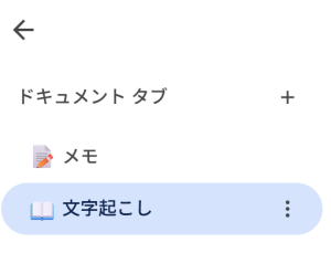 Googleドライブ内で、文字起こしと議事録が一つのドキュメントとなって保存されています。左側にタブが表示され、「文字起こし」タブでは会議の内容を文字起こしした全文が、「メモ」タブでは会議の内容が要約された議事録を表示することができます。