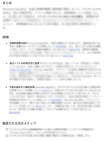 この議事録生成の精度の高さにはかなり驚きました。今回の議事録は3段落で構成されており、一段落目は「まとめ」、二段落目は「詳細」、三段落目は「推奨される次のステップ」となっています。